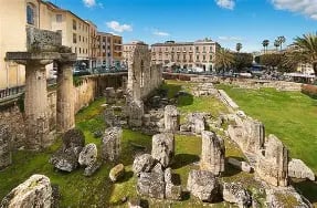 The Temple of Apollo on Ortigia, the historic heart of Syracuse, dates back to the early 6th century B.C. and is considered the oldest stone Doric temple in Sicily and one of the earliest monumental Greek stone temples in the Western Mediterranean.